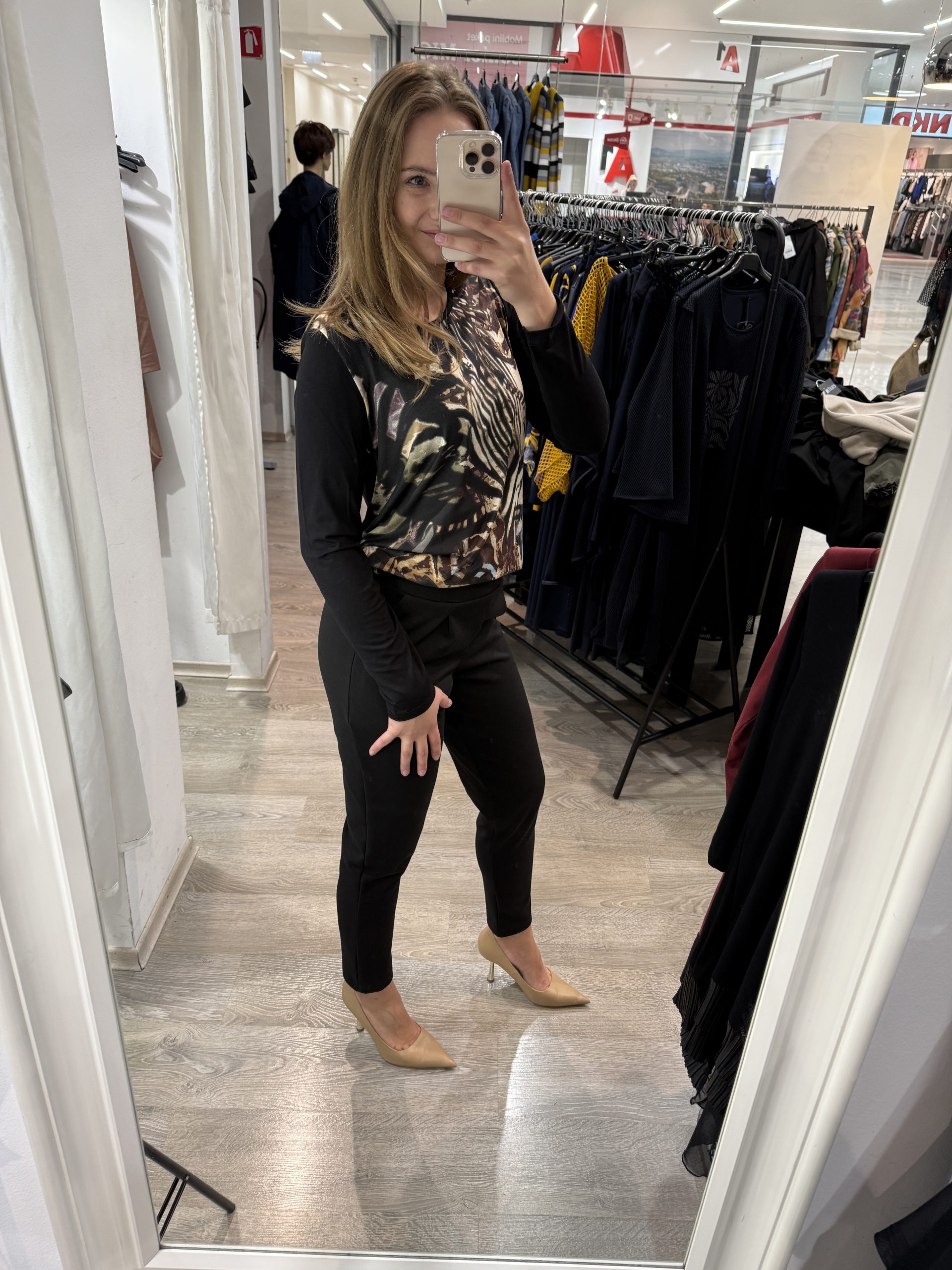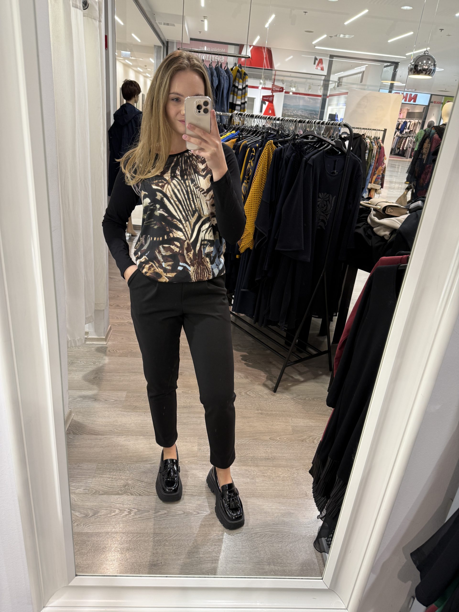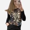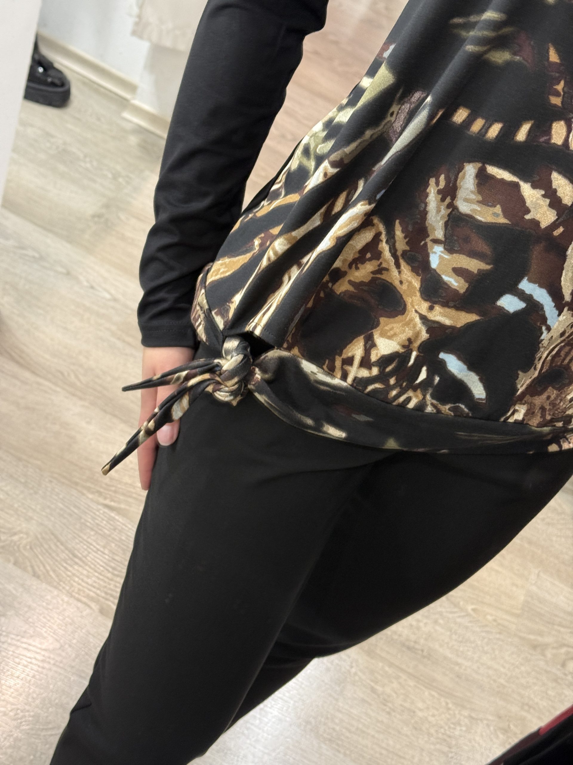 Majica je v osnovi v črni barvi, spredaj pa ima potisk jesenskih barv. Spodaj ima rahel patent, ki pa se na levi strani prilagaja z vezanjem, ki je tudi kot detajl.