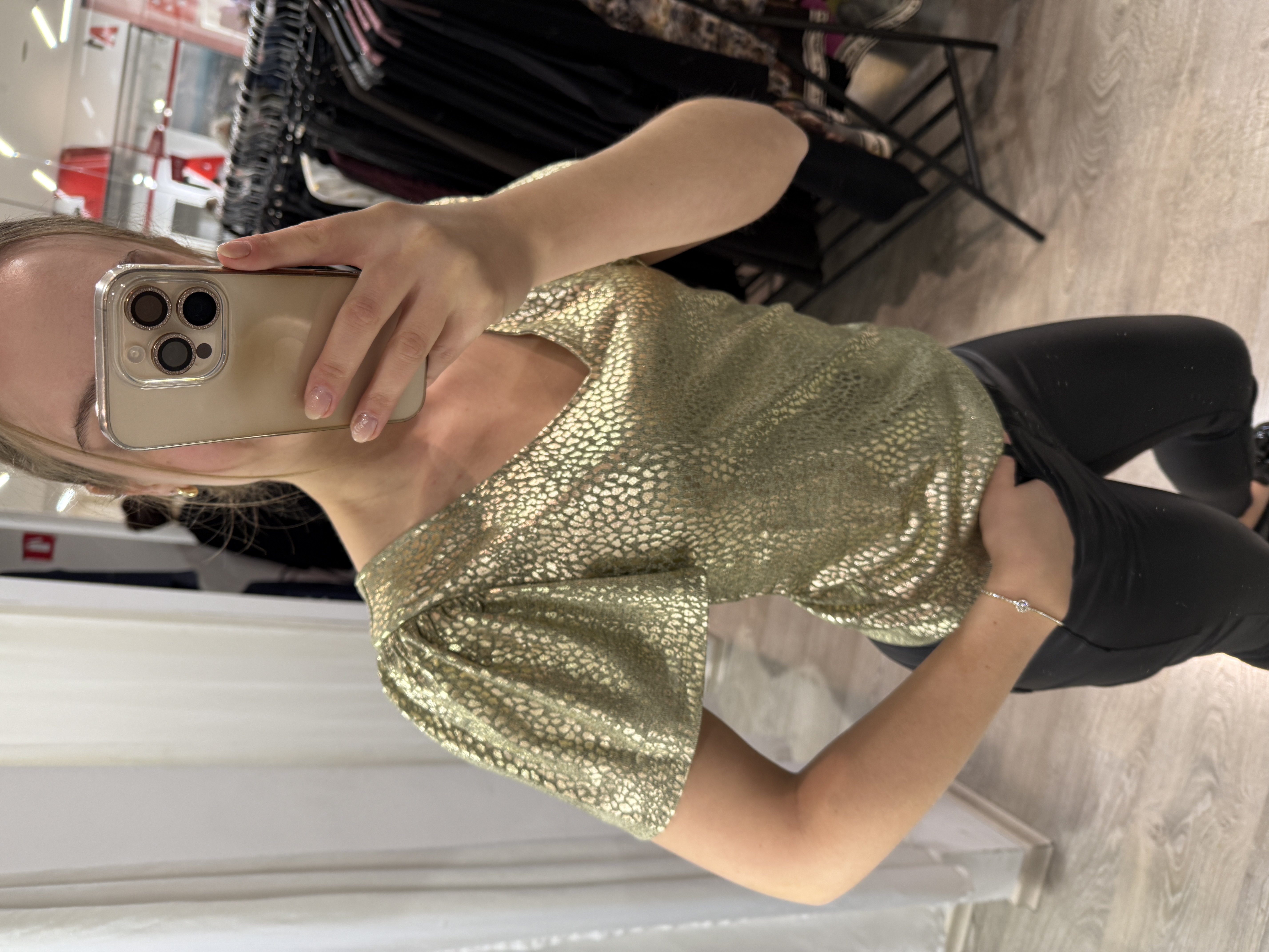 Majica je v zlati barvi in ima zlati potisk .Ovratnik je na V izrez spregaj in zadaj, ki pa se zaveže s takom. Je elegantnega videza in lepo padajoča.