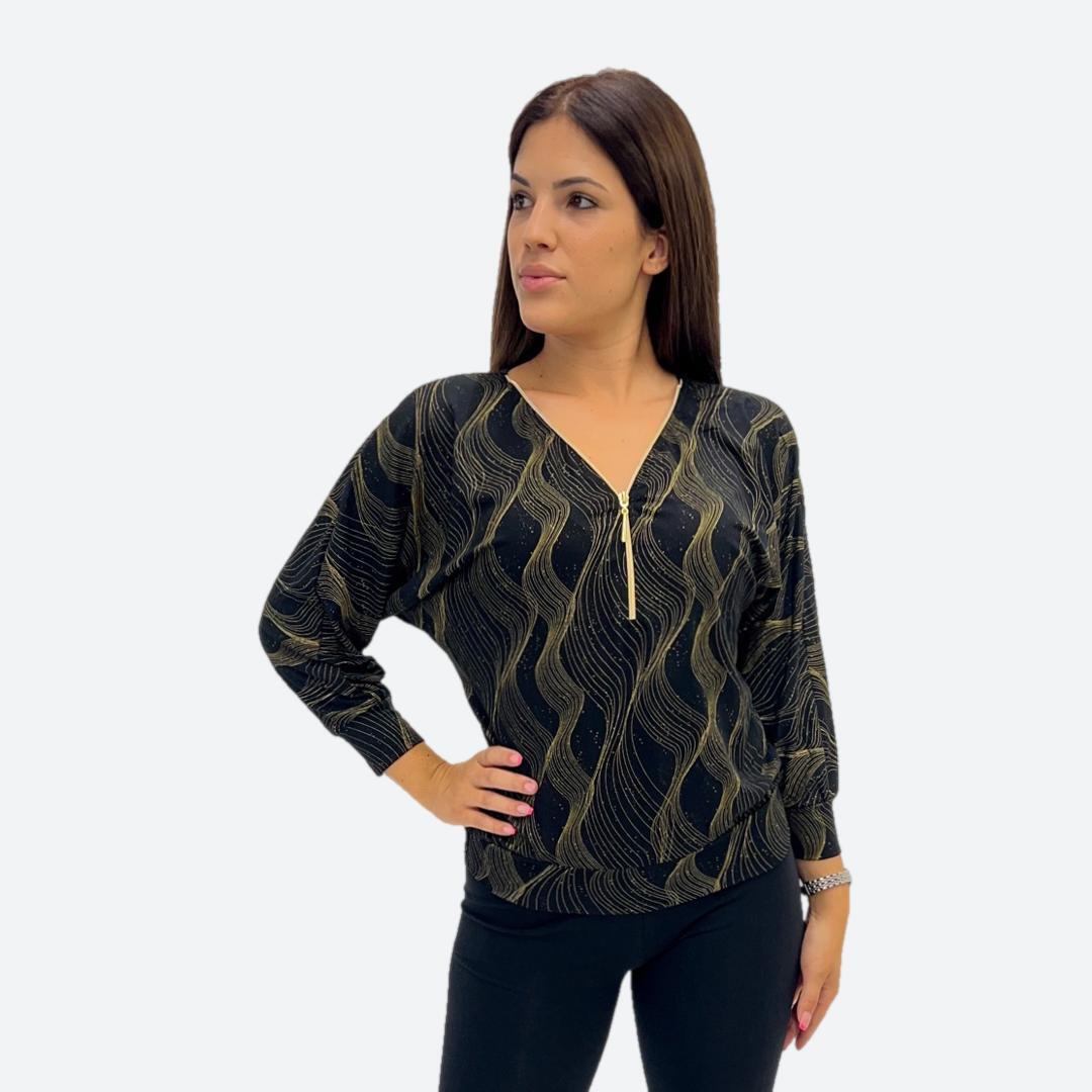 Majica Peca je v črni barvi z dodanim tiskom zlatih črtic. Majica ima 3/4 rokava na metulja. Na sprednji strani ovratnik krasi dekorativna zlata zadrga.