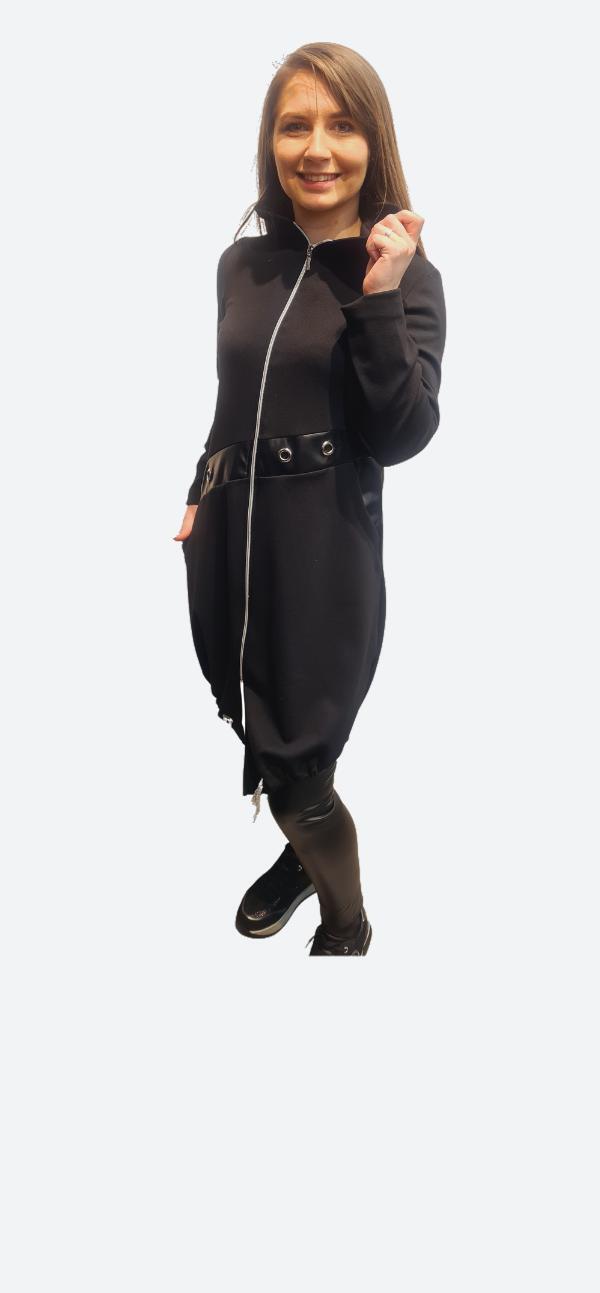 Plašč Adela v črni barvi. Plašč je na sprednji strani kombiniran z umetnim usnjem, katerega krasijo kovinski neti v srebrni barvi. V srebrni barvi je tudi zadrga. Plašč ima dva žepa.