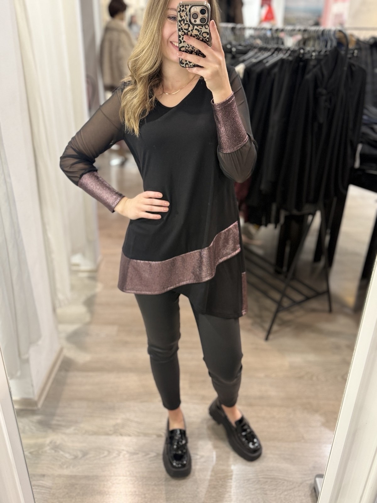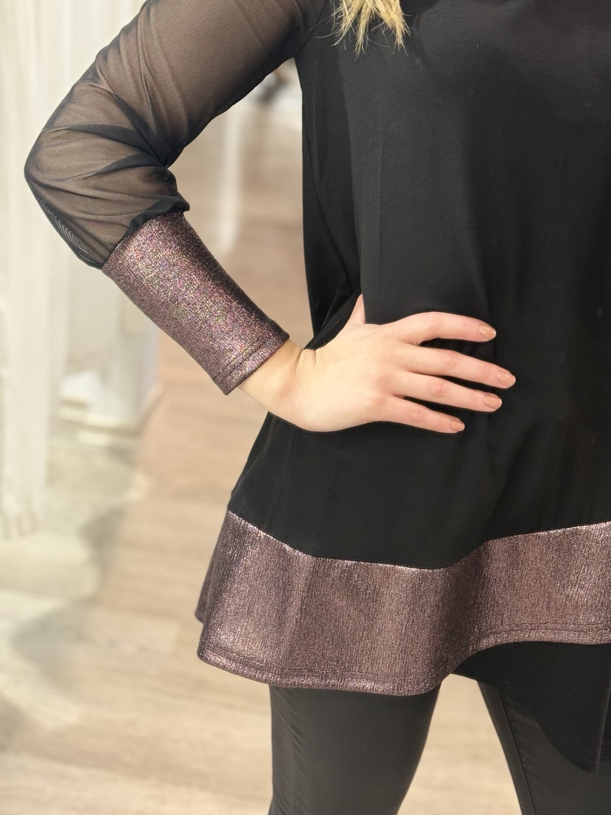 - tunika Danaja v kombinaciji črne barve in svetlečega blaga