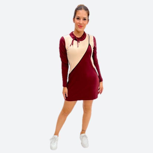 Tunika je v osnovi v brdo rdeči barvi, na sprednjem delu je kombinirana z bež blagom in črno zadrgo. Ima dolga rokava in višji ovratnik.