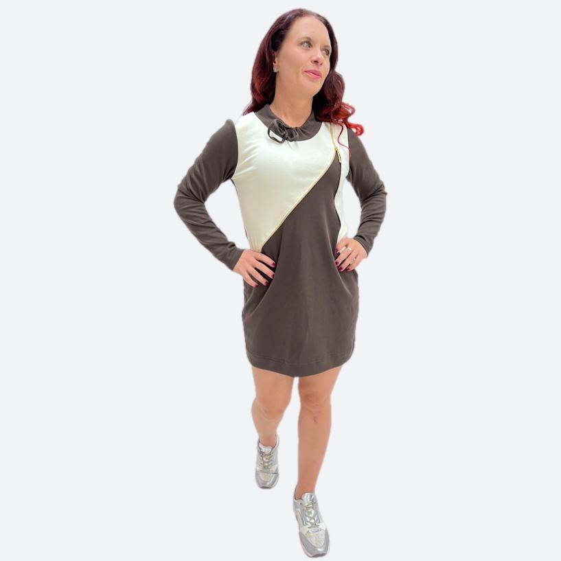 Tunika je v osnovi v rjavi barvi, na sprednjem delu je kombinirana z bež blagom in zlato zadrgo. Ima dolga rokava in višji ovratnik.